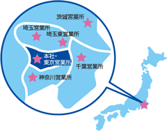 当社は、東京・千葉・神奈川・埼玉・埼玉東・茨城の6カ所に営業所を構え、首都圏全域をカバーしております。各営業所には自社倉庫があり、豊富な在庫を活用した自社配送システムによりスピーディに商品をお届け致します。また、拠点間の連携により、デリバリーから施工に至るまで、広域な対応も可能です。きっと皆様のお役に立てると確信しております。